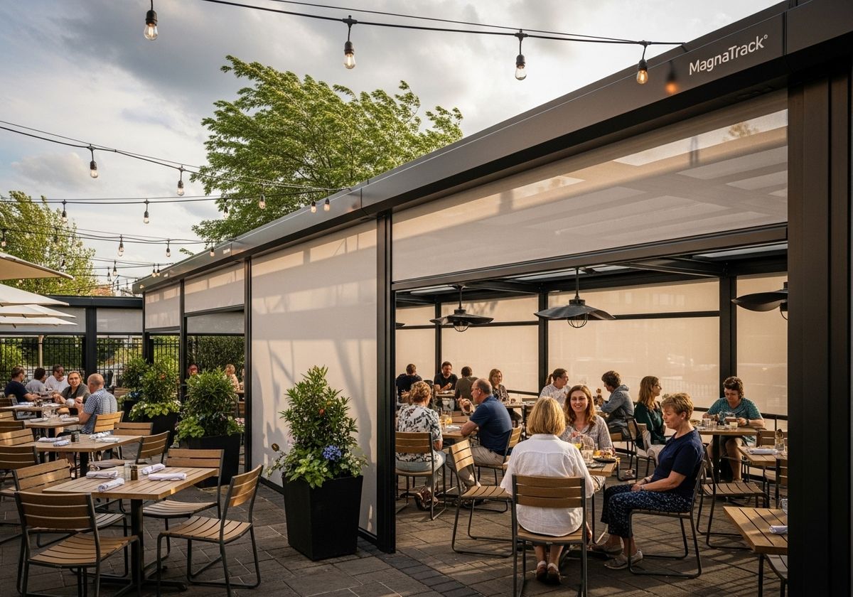 MagnaTrack systems are designed to withstand high winds and provide a secure barrier against the elements. For restaurants, this means being able to keep your patio open and inviting, even when the weather is less than ideal. Electric roll down hurricane shutters offer an additional layer of protection, ensuring your outdoor space remains functional and safe during severe weather events.